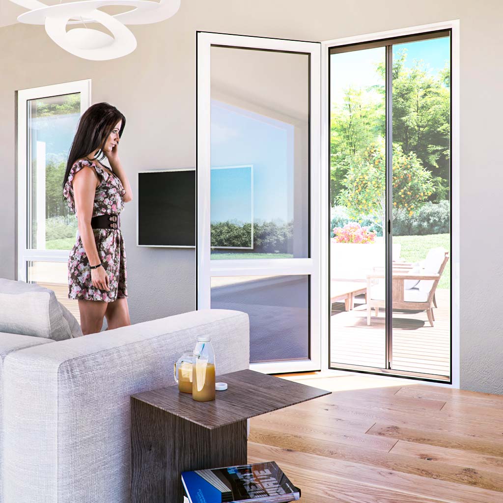 Alle Genius-Rollup-Kästen werden standardmäßig mit einem grauen Fiberglas-Gewebe (18x16) geliefert. Sie sind jedoch auch mit alternativen Netzen und Sonnenschutzgeweben erhältlich. Alle Kassetten der Rollo-Systeme sind in vertikaler, einflügliger und doppelflügliger horizontaler Ausführung erhältlich.